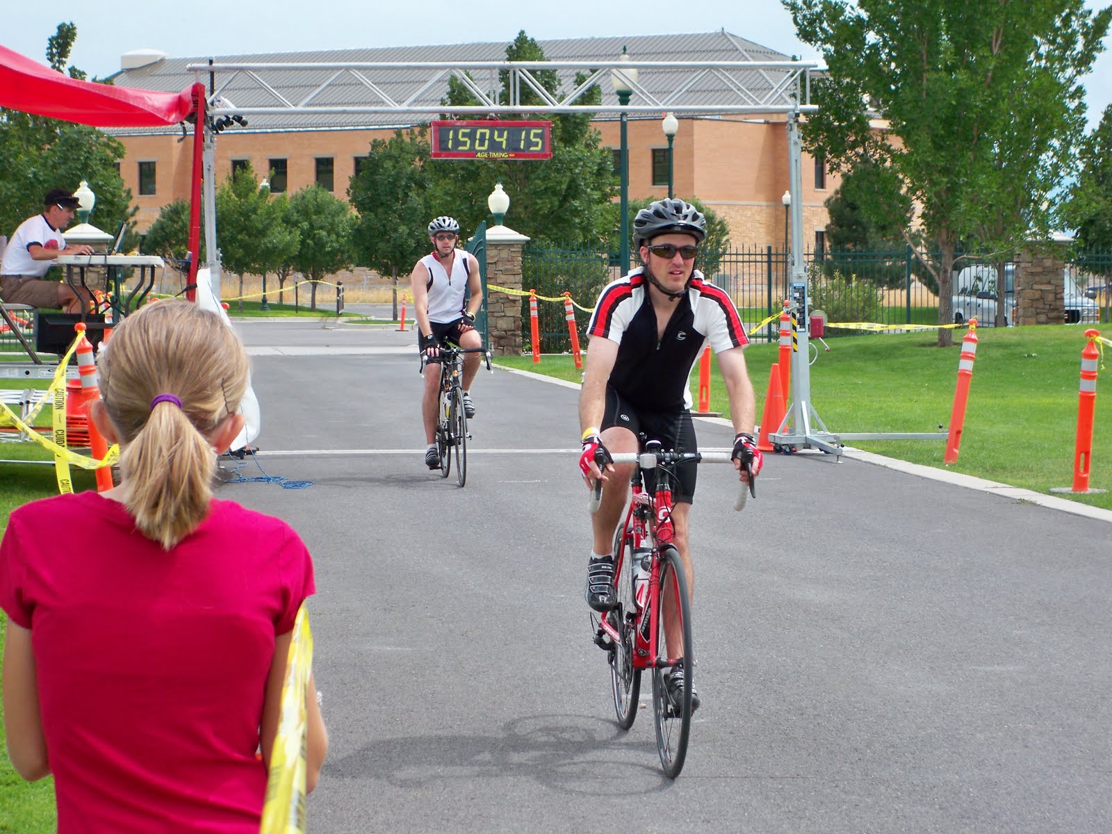 I have to tell you about a friend I met. When I was biking up the first hill I was right behind her and we were cheering each other on. I passed her after the hill but then she passed me again and we were together on the second hill cheering each other on again. Then I was right behind her in the run, so I caught up to her. We ran together for a bit. When we were on the last mile, she said "We need to finish together." I said, "Wanna hold hands as we finish?" And she said, "Yeah, let's do it." Our speed was pretty fast (for me) that last mile and I give her all the credit. I couldn't have done it without her. Around the Scera Shell, we grabbed hands and finished at the exact same time! Thanks Abby! You were awesome!